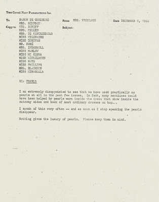 "I am extremely disappointed to see that we have used practically no pearls at all in the past few issues. In fact, many necklines could have been helped by pearls worn inside the dress that show inside the cutaway sides and back of most ordinary dresses on top...